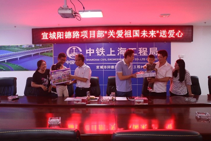 項目兩位女員工與丈夫不在一個項目部,獨自帶小孩工作生活,工程項目繁忙,家庭也不能團聚,為使員工子女過上一個有意義的兒童節(jié),把項目“職工小家”建設(shè)工作落到實處,項目部特意為小朋友挑選適合的禮物。6月1日,項目黨支部書記賈述榮代表項目部向2名小朋友送去節(jié)日禮物,在為小朋友們送去祝福的同時,也向員工的辛勤工作表示了衷心感謝,并特意給她們放假半天,帶孩子走出項目部開展親子互動活動,項目青年員工與2名小朋友進行了互動游戲。