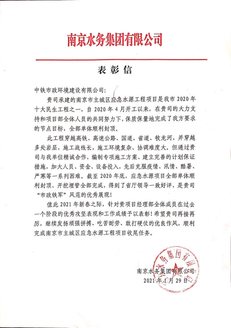 自2020年4月開(kāi)工以來(lái),南京市主城區(qū)應(yīng)急水源工程項(xiàng)目保質(zhì)保量完成節(jié)點(diǎn)目標(biāo),全部單體順利封頂,開(kāi)挖埋管全部完成。該工程施工戰(zhàn)線長(zhǎng),施工環(huán)境復(fù)雜、協(xié)調(diào)難度大,項(xiàng)目部精心編制專項(xiàng)施工方案、建立完善的計(jì)劃保證措施,從人員、資金、設(shè)備等角度加大投入力度,保證施工進(jìn)度。該工程在為當(dāng)?shù)孛裆聵I(yè)發(fā)展送去便利的同時(shí),也良好地展現(xiàn)了“市政鐵軍”頑強(qiáng)拼搏、吃苦耐勞的精神面貌。為此,南京水務(wù)集團(tuán)有限公司發(fā)來(lái)表彰信。